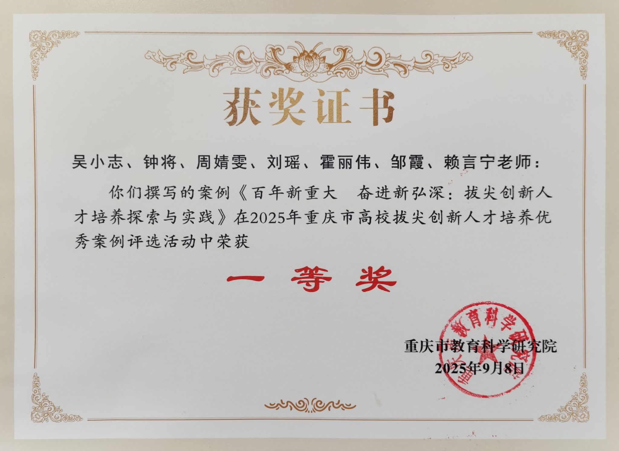 近日,重庆市教育科学研究院正式公示了“重庆市高校拔尖创新人才培养优秀案例评选”结果。经过严格的专家评审程序,我院报送的案例《百年新重大 奋进新弘深:拔尖创新人才培养探索与实践》项目从众多参评案例中脱颖而出,荣获一等奖。
