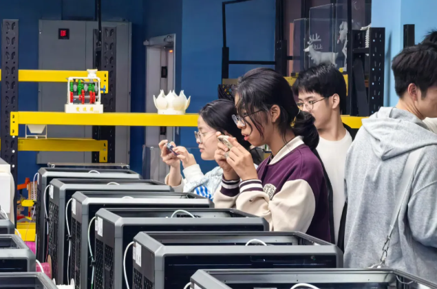 随后,一行人来到了3D打印实验室。这里先进的3D打印设备和技术一应俱全,能够满足不同领域的创新需求。陈锦威老师先为同学们讲解了3D打印的基本原理、技术特点以及应用领域,还结合生动的案例,让同学们对3D打印技术有了更为直观和深入的了解。之后,同学们在老师的指导下,亲身体验了3D打印组装件的制作过程。