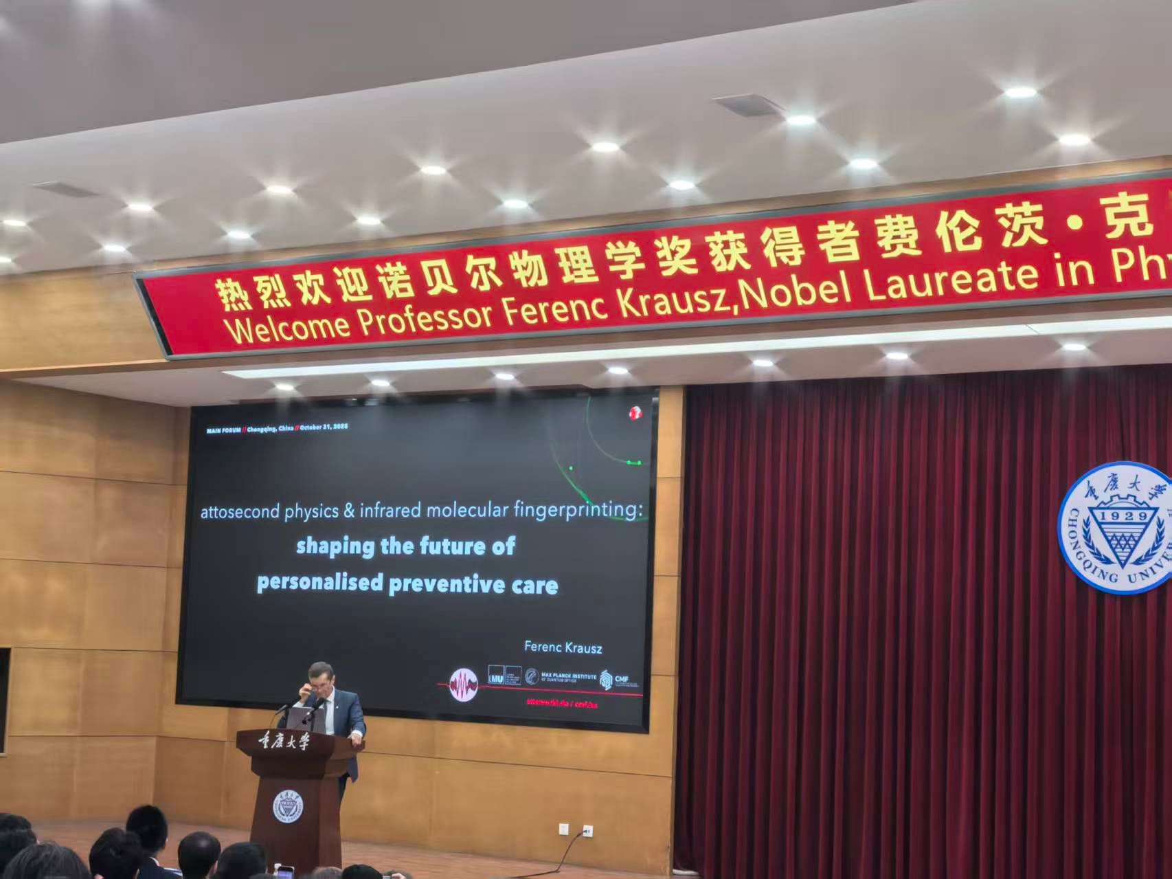 11月1日下午,重庆大学A校区民主湖报告厅座无虚席。2023 年诺贝尔物理学奖获得者、德国马克斯-普朗克量子光学研究所所长、“阿秒物理学之父” 弗伦茨·克劳斯(Ferenc Krausz)教授受邀带来主题为“Attosecond Physics and Infrared Molecular Fingerprinting: Reshaping the Future of Personalised Preventive Care”的学术讲座。弘深学院组织师生积极参加讲座,近距离感受世界级科学家的学术魅力。