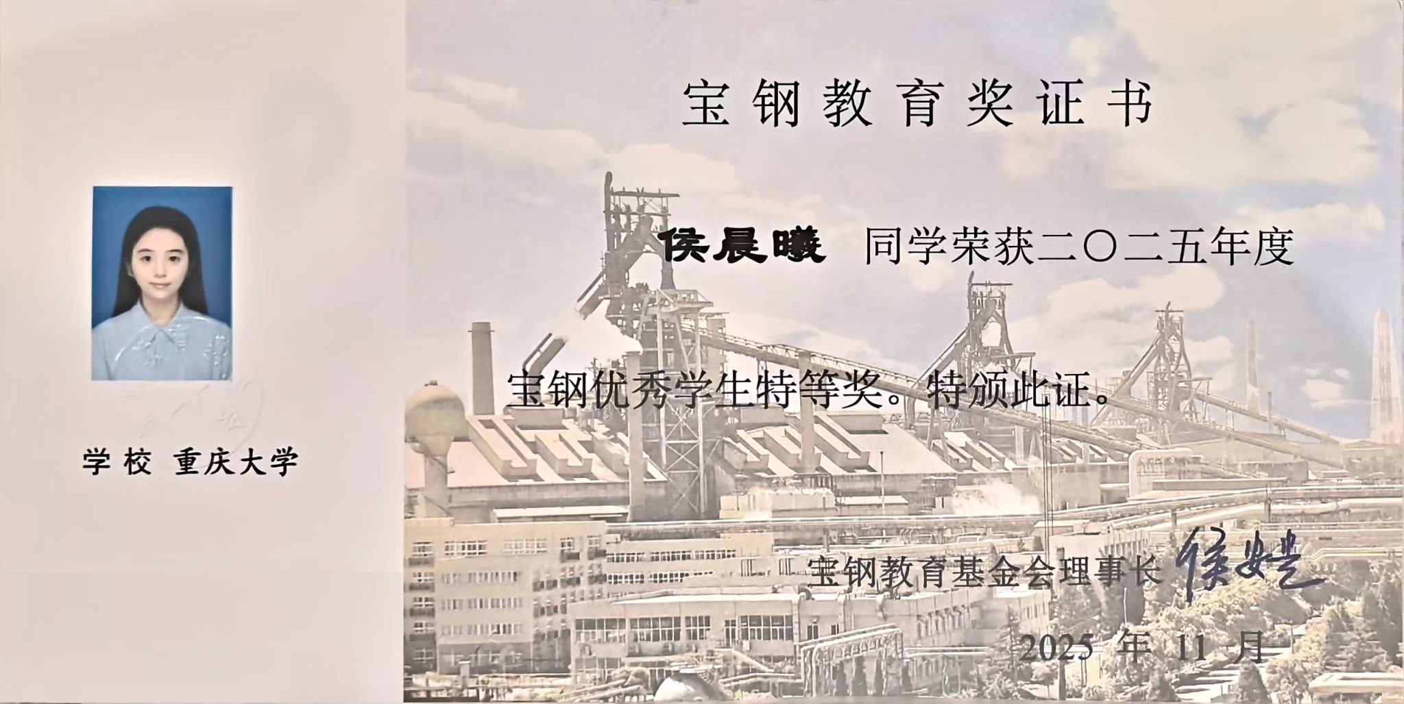 2025年11月15日, 2022级物理拔尖班本科生侯晨曦凭借在学术科研、社会实践及综合素质方面的突出表现,从全国高校优秀学子中脱颖而出,荣获2025年度宝钢优秀学生特等奖(全国每年仅15名本科生获奖)。这一荣誉不仅是对其个人成就的高度认可,更彰显了弘深学院“拔尖创新人才培养”模式的显著成效。
