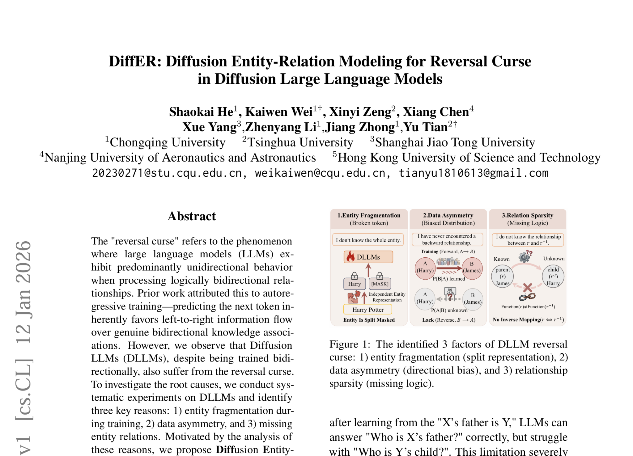 贺绍凯同学的研究聚焦扩散式大语言模型(Diffusion LLMs)中的"反转诅咒"(Reversal Curse)问题。所谓"反转诅咒",是指大语言模型在处理逻辑上双向对称的关系时表现出明显的单向性——例如模型能够回答"X的父亲是谁",却难以反向回答"Y的孩子是谁"。已有工作普遍将这一现象归因于自回归训练范式下从左到右的信息流偏置,然而贺绍凯同学及其合作者首次系统性地观察到:即使是天然采用双向训练的扩散式大语言模型,同样深陷"反转诅咒"之中。针对这一问题,论文从训练过程中的实体碎片化、数据非对称性以及关系建模缺失三个层面深入剖析根因,并提出整体实体掩码(Whole-Entity Masking)、对称数据增强(Symmetric Data Augmentation)以及逆向关系建模(Inverse Relation Modeling)三项关键技术。研究团队在 LLaDA-8B、Dream-7B 等当前主流扩散式大语言模型上进行了充分的实验验证,结果表明所提方法能够显著缓解扩散式大语言模型的反转诅咒现象,为大语言模型的双向知识关联建模提供了新思路,对推动新一代语言模型架构发展具有重要意义。